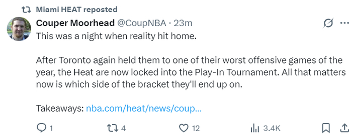 热火记者Couper写道:这是一个让人深有感触的夜晚,热火在多伦多再度被限制出本赛季最差的进攻表现,热火已经确定参与附加赛,现在唯一的悬念就是热火最终排在附加赛上半区还是下半区。
